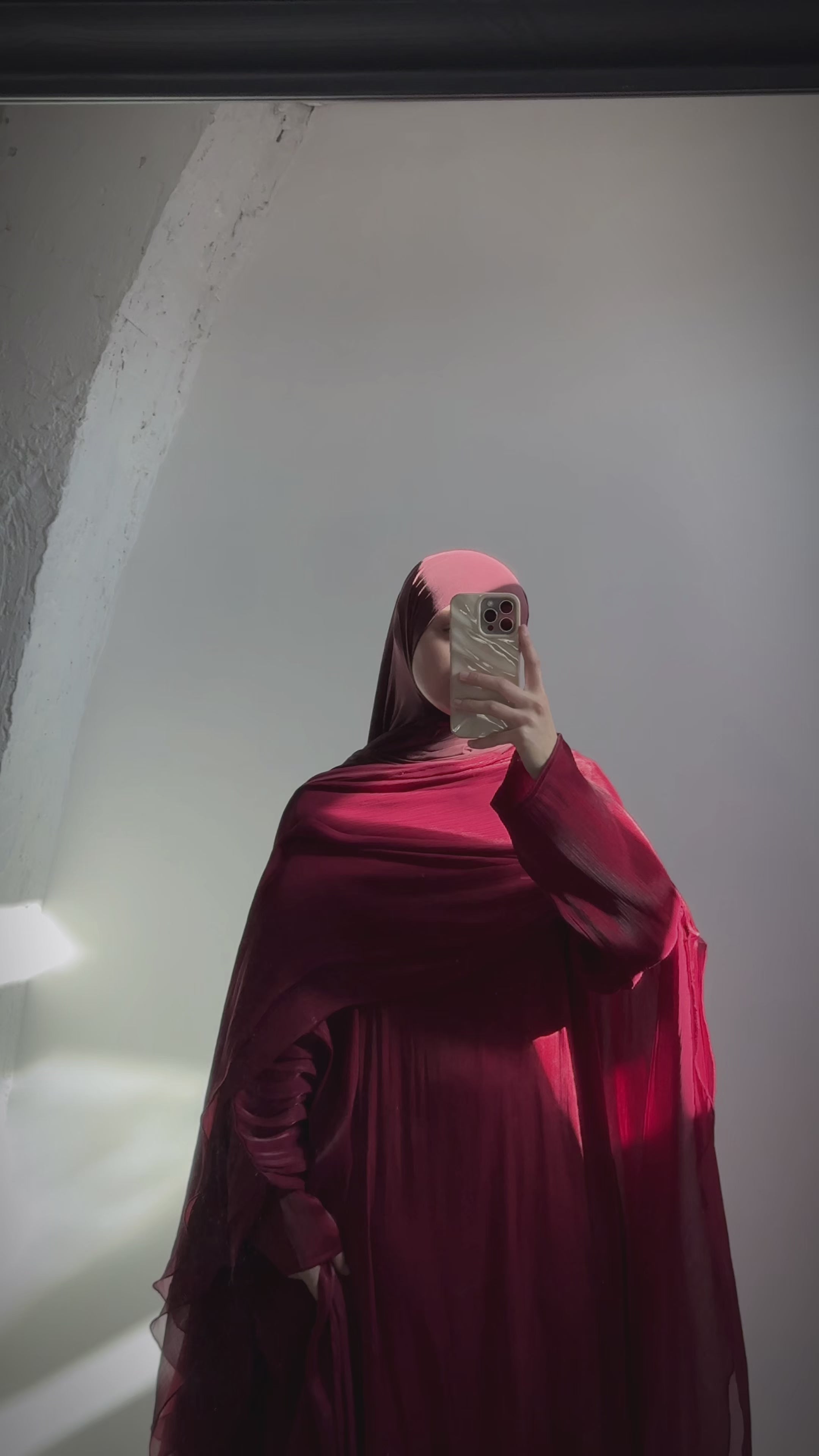 Une élégante farasha en organza doublée, fluide et entièrement couvrante, un col haut et une jolie retombée ondulée, de quoi se sentir comme une princesse le temps d'une journée.